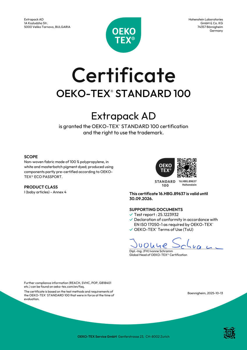This certificate ensures that the final product does not contain substances harmful to human health, such as allergens, formaldehyde, pesticides, chlorophenols, unapproved azo dyes, or heavy metals.Product class 1: Articles for babies and young children up to 3 years old